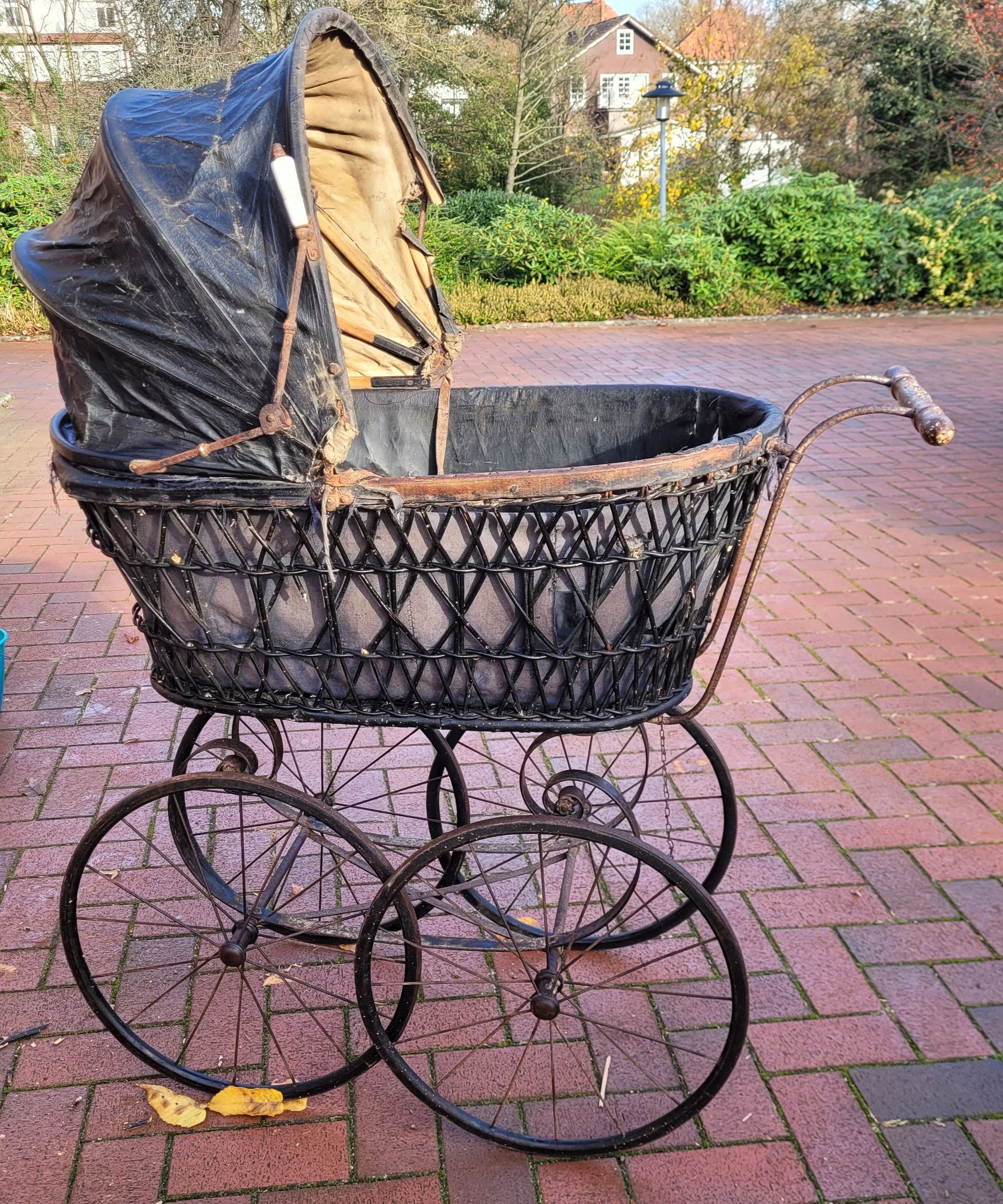 Der Kinderwagen besteht aus einem schwarz gefärbten Korbgeflecht, einem stabilen Metallfahrgestell und eisenbeschlagenen Holzrädern, die auch nach über einem Jahrhundert noch erstaunlich leicht rollen. Das Verdeck, außen schwarz und innen mit hellem Stoff ausgeschlagen, besitzt typische Porzellangriffe, wie sie um 1900 bei besseren Modellen üblich waren. Die Bauweise und Materialien weisen klar in die Zeit, bevor Gummireifen und industriell gefertigte Stoffverdecke zum Standard wurden.