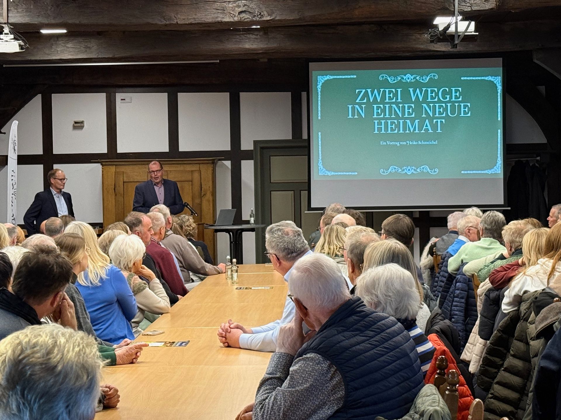 Die sprichwörtlich fallende Stecknadel wäre im voll besetzten Heimathaus Sittensen zu hören gewesen. Heiko Schmeichel ist es am letzten Sonntag gelungen, mit seinem beeindruckenden Vortrag zur Geschichte und den Fluchtwegen seiner Familie die über 100 Besucherinnen und Besucher in seinen Bann zu ziehen.