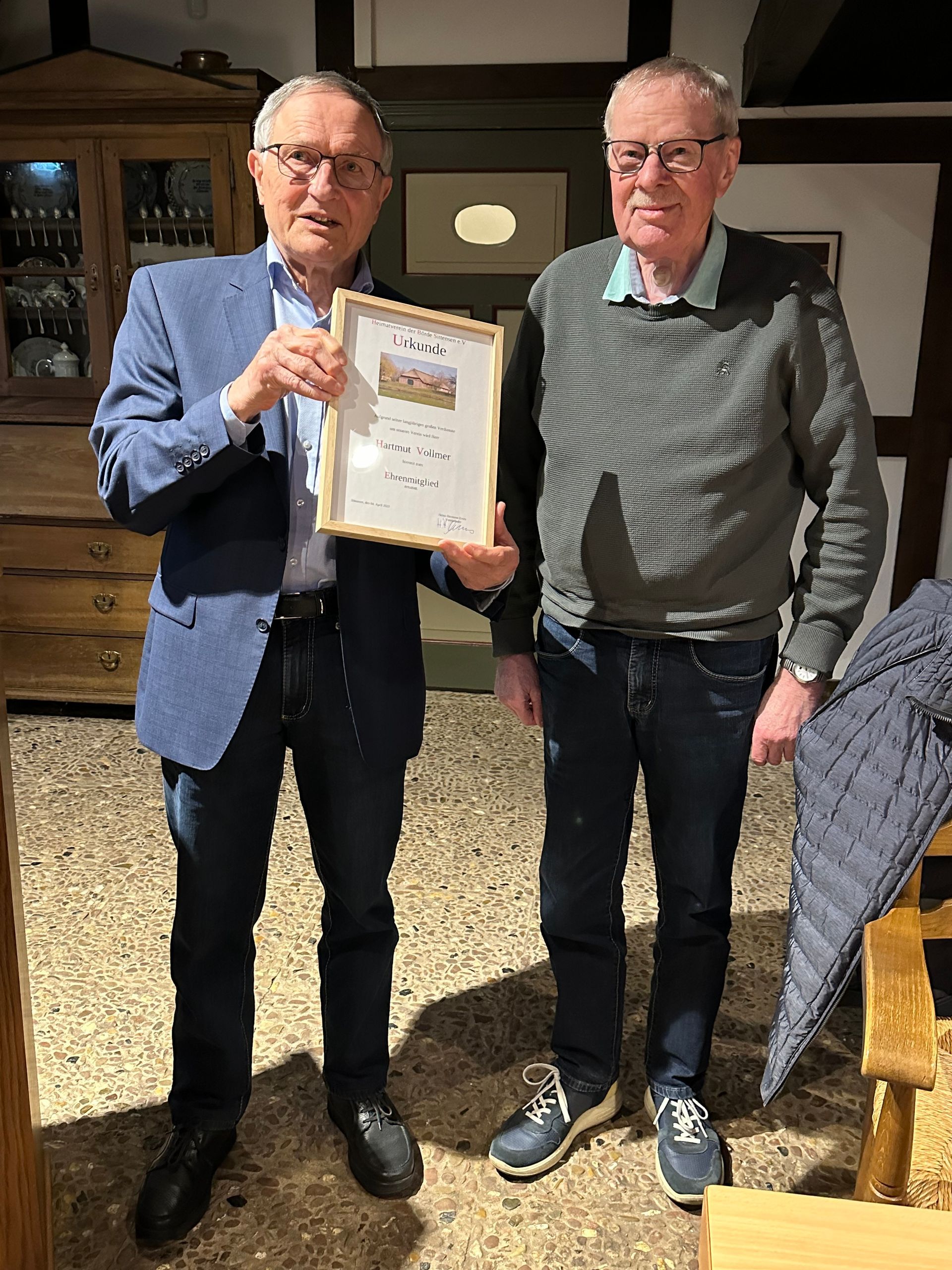 Abschließend ergriff der Vorsitzende Heinz-Hermann Evers noch einmal das Wort und bedankte sich bei seinem bisherigen Stellvertreter Hartmut Vollmer für die hervorragende Zusammenarbeit. Aufgrund seiner langjährigen großen Verdienste um den Heimatverein wurde Hartmut Vollmer zum Ehrenmitglied des Heimatvereins ernannt. Der Geehrte bedankte sich bei der Versammlung und erklärte zur Freude aller, dass er zwar die Führungsämter aufgrund seines Handicaps des Sprechens mit Stimmprothese abgegeben habe, aber natürlich weiterhin im Heimatverein mitarbeiten und mit seiner Expertise zur Verfügung stehen werde.