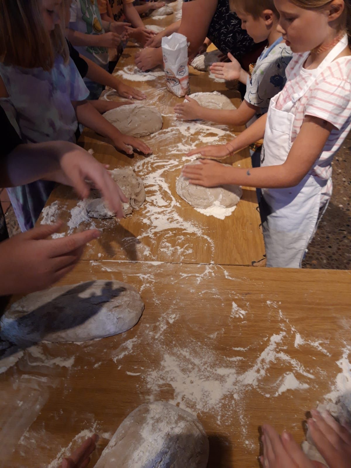 Die jungen Teilnehmerinnen und Teilnehmer brachten ihre Rührschüsseln von zu Hause mit und rührten, kneteten und formten unter fachkundiger Anleitung ihren Teig. Die vorbereiteten Zutaten standen bereit, und Schritt für Schritt wurde alles gemeinsam in den historischen Steinbackofen geschoben.