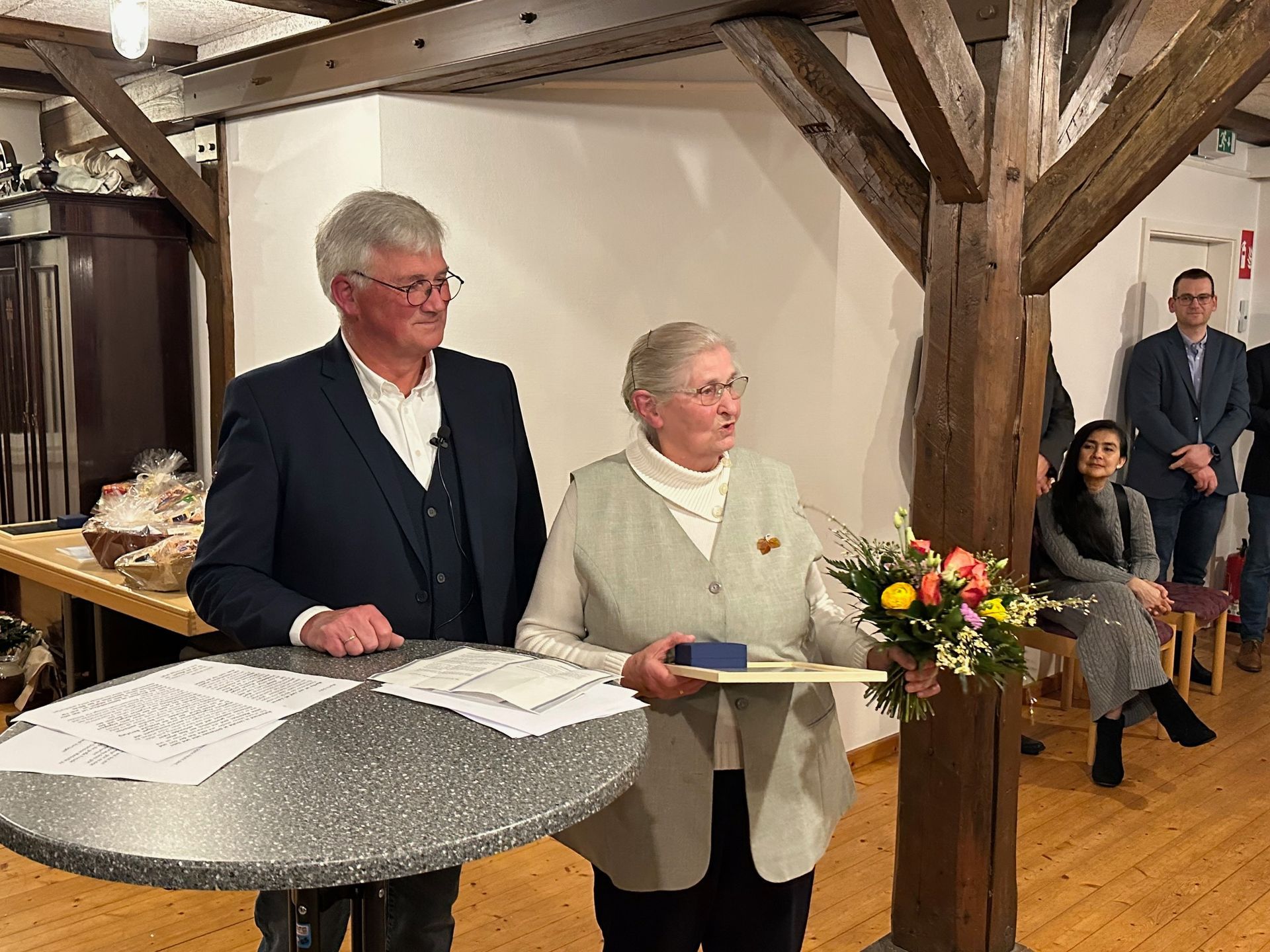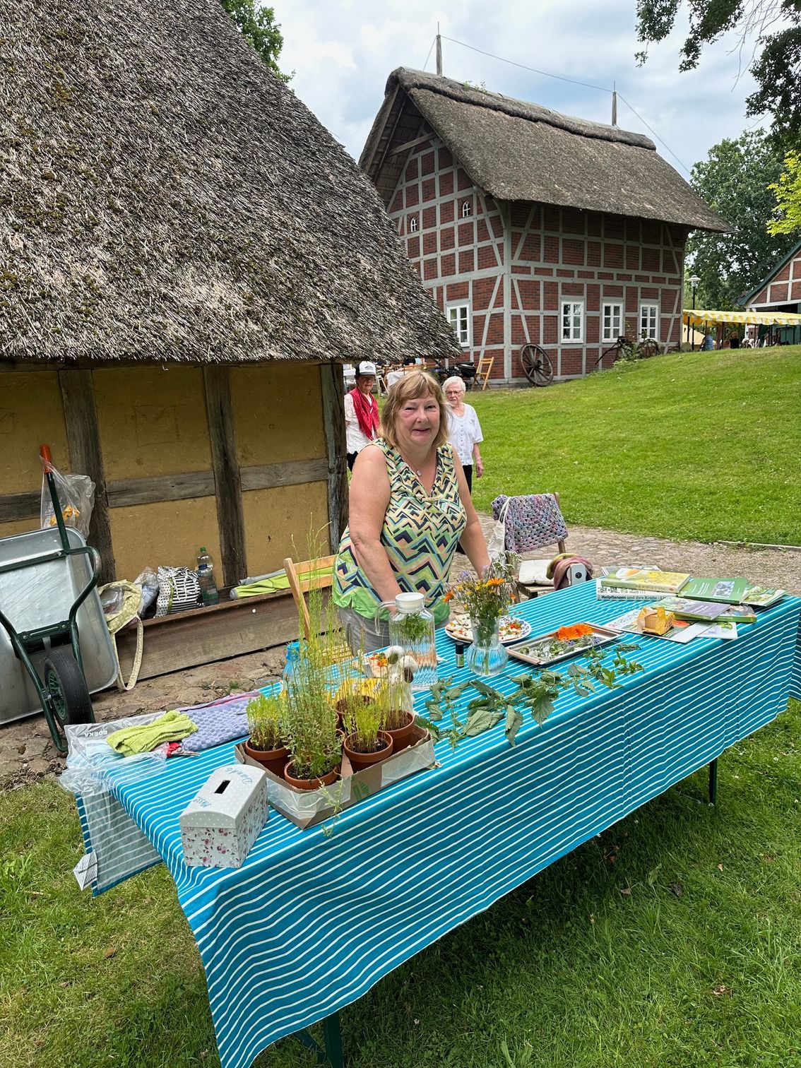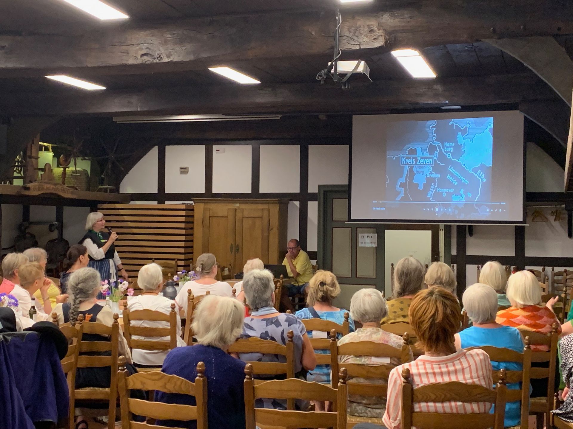 Als Dank überreichte Kerstin Thölke als Leiterin des Handwerkermuseums ein kleines Präsent an Herrn Dörfler und wies die Zuhörer auf die noch bis zum 11. August laufende Ausstellung „Meilensteine. Sittensen im Wandel der Zeit“ im Handwerkermuseum in Sittensen hin.