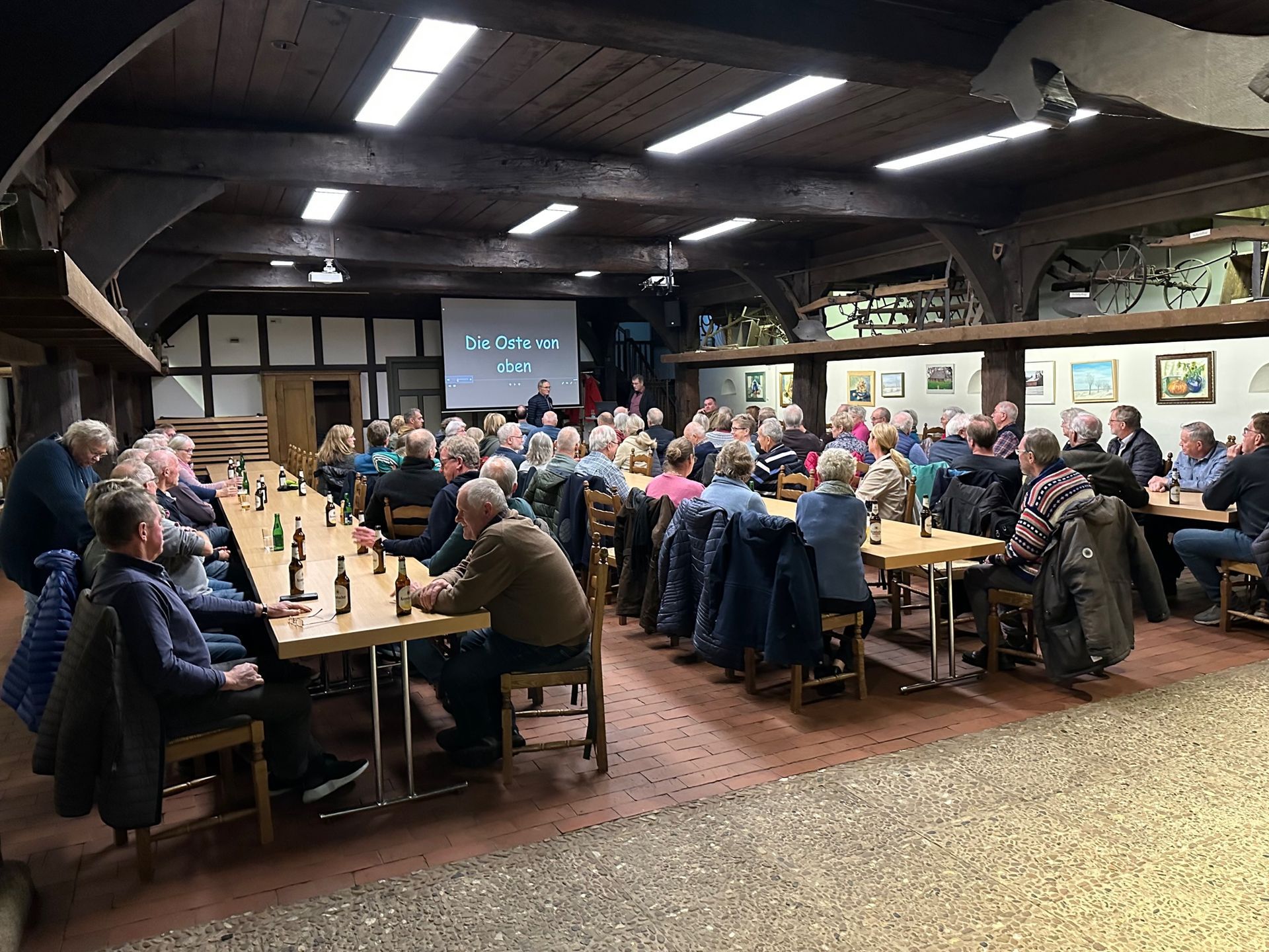 Die rund 90 Anwesenden im gut gefüllten Heimathaus verfolgten interessiert die launigen Ausführungen Meyers zu einem Film, der den Verlauf der Oste von der Quelle bis Bremervörde auf 75 Flusskilometern zeigt. Der Film entstand 2015 zum 50-jährigen Jubiläum des Unterhaltungsverbandes und wurde aus einem Kleinhubschrauber mit einer Handkamera aufgenommen. Damit entstanden aus relativ geringer Höhe Perspektiven, aus der die Oste bislang nicht zu sehen war.