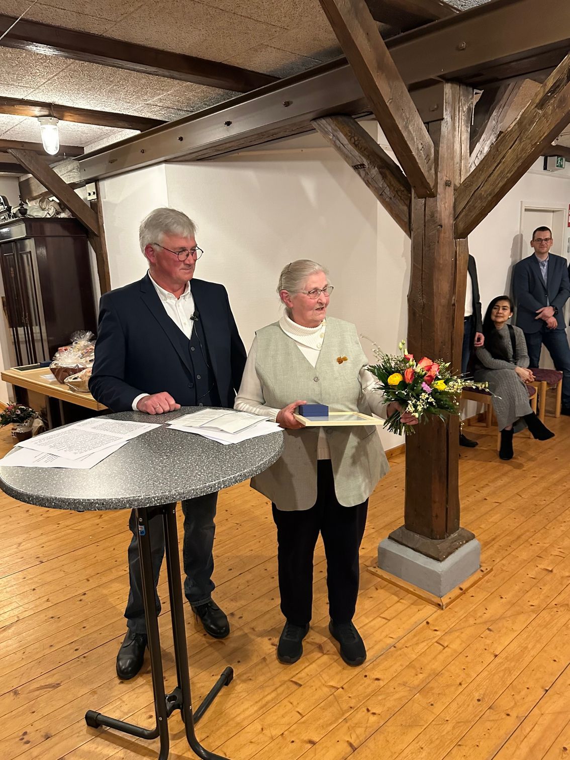 Stefan Tiemann lies es sich nicht nehmen und nutzte die Gelegenheit etwas Werbung für den Verein zu machen, was offensichtlich auch fruchtete, sodass bereits bei der Präsentkorbübergabe als Dankeschön des Festausschusses, Bürgermeister Gerd Kaiser seinen Beitritt zum Heimatverein verkündete. Doch er blieb nicht der einzige. Weitere Beitrittswünsche erreichten Esther Meyer-Biemold und Stefan Tiemann an diesem Abend.