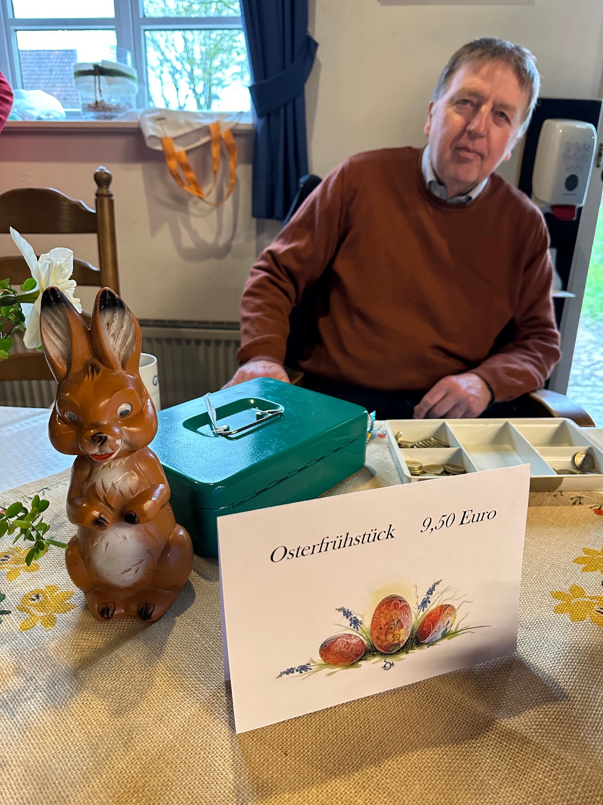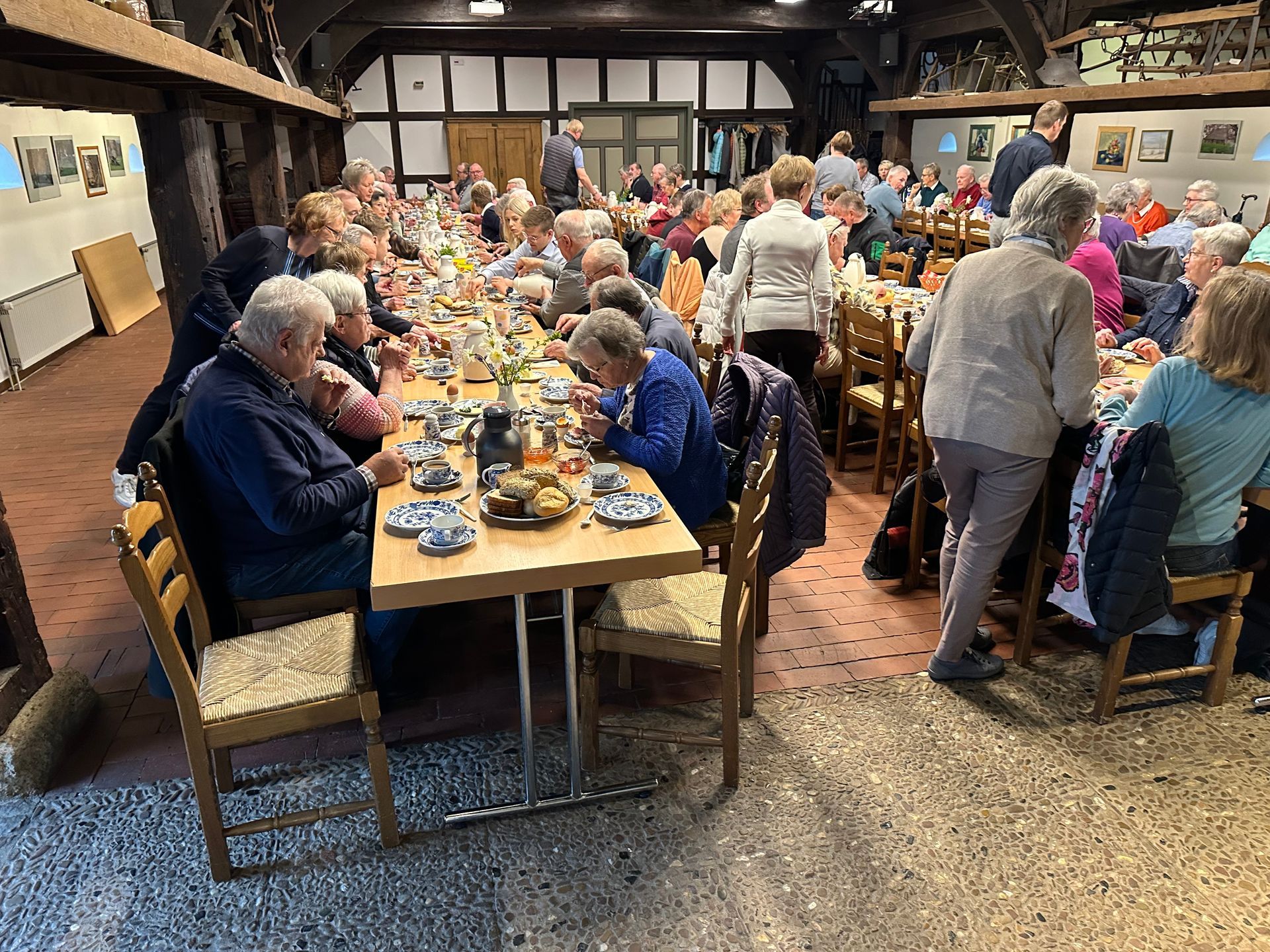 Im trotz des wenig feierlichen Wetters gut besuchten Heimathaus ließen sich die Besucher mit Brot und Brötchen, herzhaften und süßen Belegen und natürlich frisch gekochten Eiern ausgiebig verwöhnen. Für Kaffee, Tee und Kaltgetränke war natürlich auch reichlich gesorgt, so dass es in angenehm rustikaler Atmosphäre wieder viele nette Begegnungen und Gespräche zum traditionellen Osterfrühstück gab.