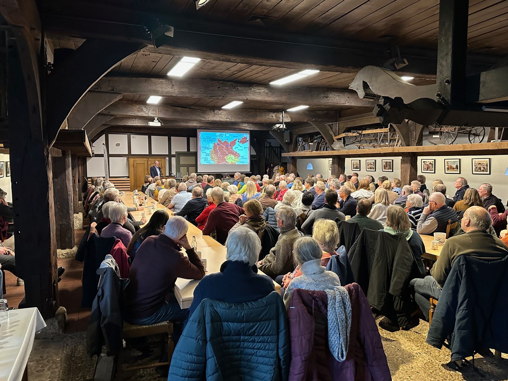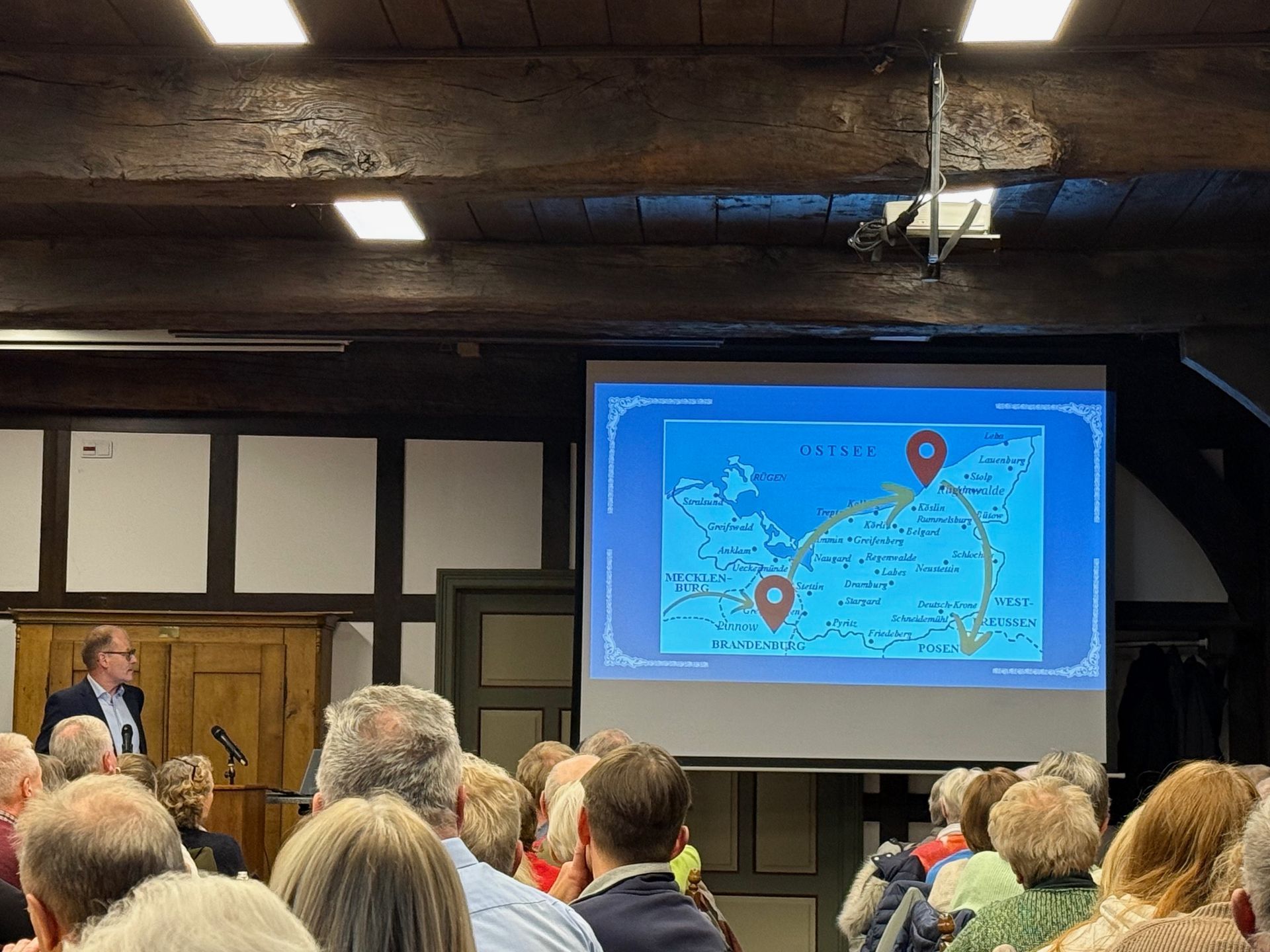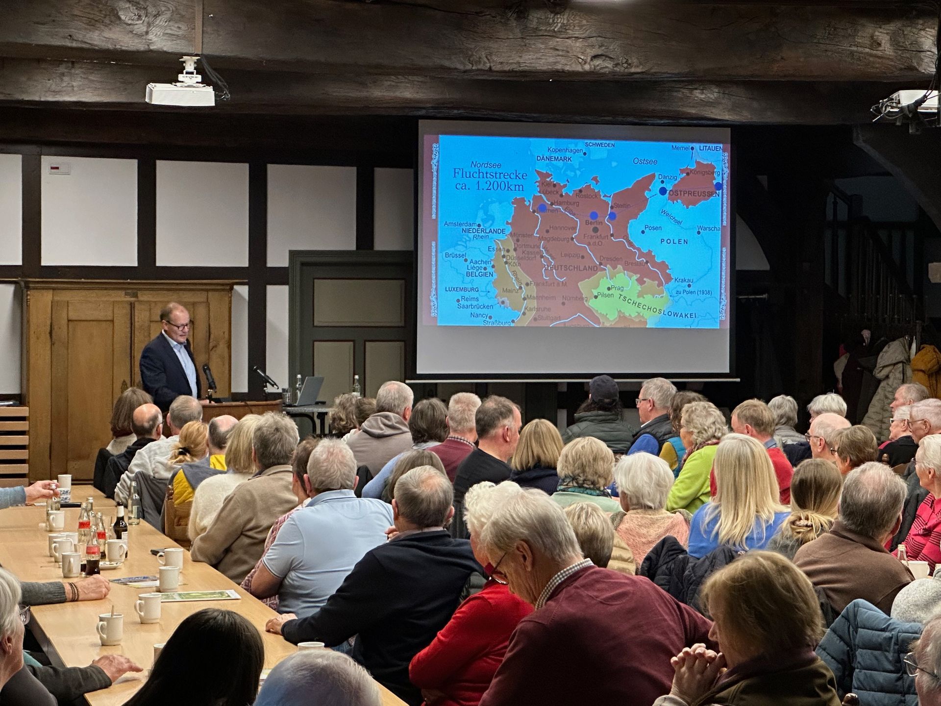 Die sprichwörtlich fallende Stecknadel wäre im voll besetzten Heimathaus Sittensen zu hören gewesen. Heiko Schmeichel ist es am letzten Sonntag gelungen, mit seinem beeindruckenden Vortrag zur Geschichte und den Fluchtwegen seiner Familie die über 100 Besucherinnen und Besucher in seinen Bann zu ziehen.